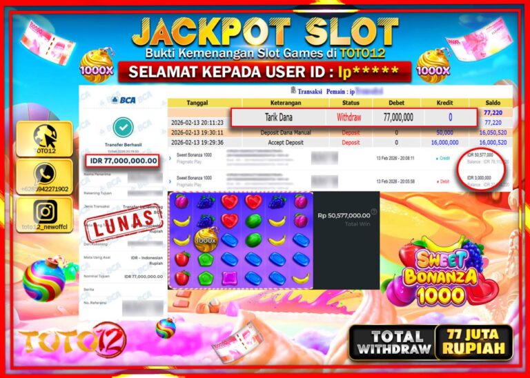 Selamat kepada Member Kami Ip****** Telah Jackpot dan berhasil mendapatkan kemenangan besar pada permainan JACKPOT SLOT GAME (SWEET BONANZA 1000) Dengan Kemenangan Sebesar Rp.77.000.000–. Setelah mengisi Fomulir Withdraw dengan Kurang waktu 1-2 Menit Dana sudah kami Trasnfer kepada Pemilik Userid dan dana sudah dapat di cairkan oleh pemenang. Bukti Pembayaran yang TOTO12 berikan merupakan Bukti Pembayaran…