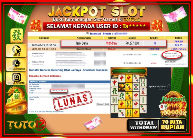 Selamat kepada Member Kami Ta****** Telah Jackpot dan berhasil mendapatkan kemenangan besar pada permainan JACKPOT SLOT GAME (MAHJONG WINS 2) Dengan Kemenangan Sebesar Rp.70.277.000–. Setelah mengisi Fomulir Withdraw dengan Kurang waktu 1-2 Menit Dana sudah kami Trasnfer kepada Pemilik Userid dan dana sudah dapat di cairkan oleh pemenang. Bukti Pembayaran yang TOTO12 berikan merupakan Bukti Pembayaran…