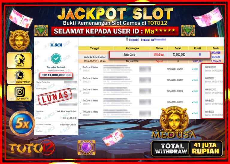 Selamat kepada Member Kami Ma****** Telah Jackpot dan berhasil mendapatkan kemenangan besar pada permainan JACKPOT SLOT GAME (THE CURSE OF MEDUSA) Dengan Kemenangan Sebesar Rp.41.000.000–. Setelah mengisi Fomulir Withdraw dengan Kurang waktu 1-2 Menit Dana sudah kami Trasnfer kepada Pemilik Userid dan dana sudah dapat di cairkan oleh pemenang. Bukti Pembayaran yang TOTO12 berikan merupakan Bukti…