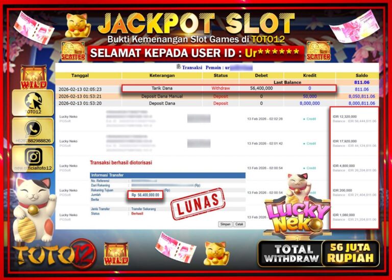 Selamat kepada Member Kami Ur****** Telah Jackpot dan berhasil mendapatkan kemenangan besar pada permainan JACKPOT SLOT GAME (LUCKY NEKO) Dengan Kemenangan Sebesar Rp.56.400.000–. Setelah mengisi Fomulir Withdraw dengan Kurang waktu 1-2 Menit Dana sudah kami Trasnfer kepada Pemilik Userid dan dana sudah dapat di cairkan oleh pemenang. Bukti Pembayaran yang TOTO12 berikan merupakan Bukti Pembayaran yang SAH…