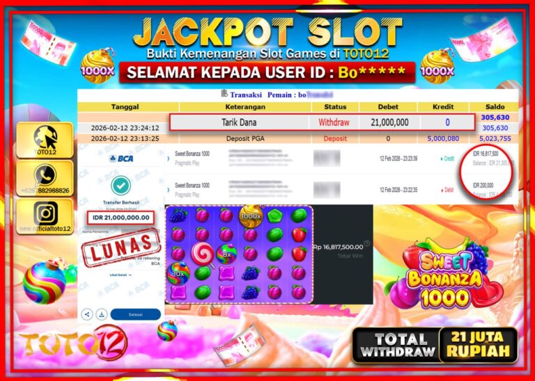 Selamat kepada Member Kami Bo****** Telah Jackpot dan berhasil mendapatkan kemenangan besar pada permainan JACKPOT SLOT GAME (SWEET BONANZA 1000) Dengan Kemenangan Sebesar Rp.21.000.000–. Setelah mengisi Fomulir Withdraw dengan Kurang waktu 1-2 Menit Dana sudah kami Trasnfer kepada Pemilik Userid dan dana sudah dapat di cairkan oleh pemenang. Bukti Pembayaran yang TOTO12 berikan merupakan Bukti Pembayaran…