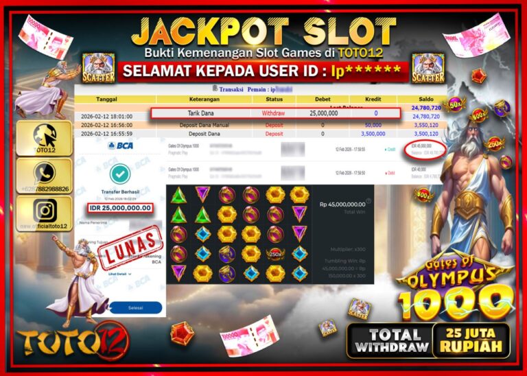 Selamat kepada Member Kami Ip****** Telah Jackpot dan berhasil mendapatkan kemenangan besar pada permainan JACKPOT SLOT GAME (GATE OF OLYMPUS 1000) Dengan Kemenangan Sebesar Rp.25.000.000–. Setelah mengisi Fomulir Withdraw dengan Kurang waktu 1-2 Menit Dana sudah kami Trasnfer kepada Pemilik Userid dan dana sudah dapat di cairkan oleh pemenang. Bukti Pembayaran yang TOTO12 berikan merupakan Bukti…