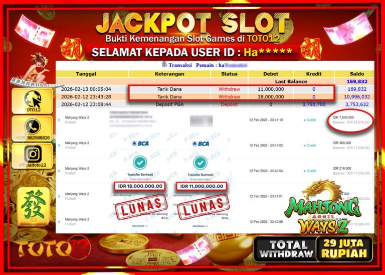 Selamat kepada Member Kami Ha****** Telah Jackpot dan berhasil mendapatkan kemenangan besar pada permainan JACKPOT SLOT GAME (MAHJONG WAYS 2) Dengan Kemenangan Sebesar Rp.29.000.000–. Setelah mengisi Fomulir Withdraw dengan Kurang waktu 1-2 Menit Dana sudah kami Trasnfer kepada Pemilik Userid dan dana sudah dapat di cairkan oleh pemenang. Bukti Pembayaran yang TOTO12 berikan merupakan Bukti Pembayaran…