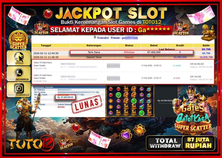 Selamat kepada Member Kami Ga***** Telah Jackpot dan berhasil mendapatkan kemenangan besar pada permainan JACKPOT SLOT GAME (GATES OF GATOTKACA SUPER SCATTER) Dengan Kemenangan Sebesar Rp.87.400.000–. Setelah mengisi Fomulir Withdraw dengan Kurang waktu 1-2 Menit Dana sudah kami Trasnfer kepada Pemilik Userid dan dana sudah dapat di cairkan oleh pemenang. Bukti Pembayaran yang TOTO12 berikan merupakan…