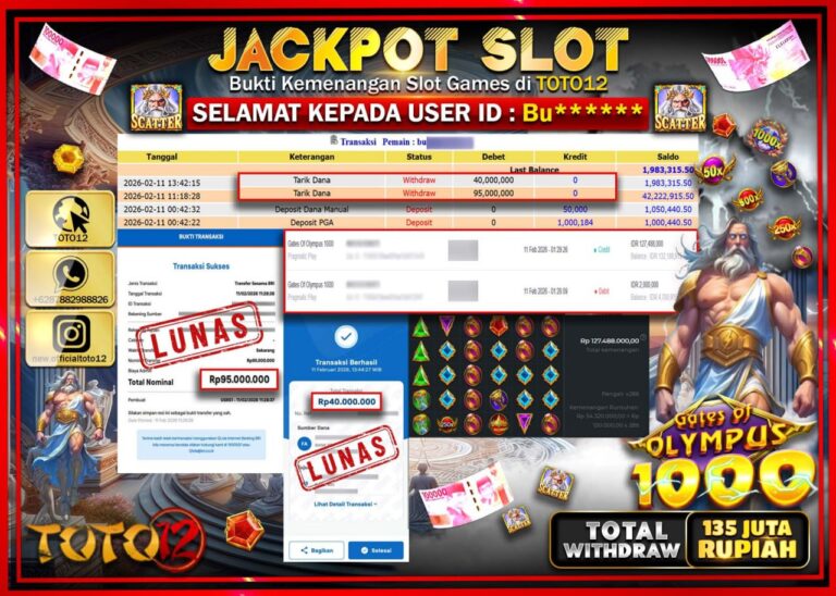 Selamat kepada Member Kami Bu****** Telah Jackpot dan berhasil mendapatkan kemenangan besar pada permainan JACKPOT SLOT GAME (GATES OF OLYMPUS 1000) Dengan Kemenangan Sebesar Rp.135.000.000–. Setelah mengisi Fomulir Withdraw dengan Kurang waktu 1-2 Menit Dana sudah kami Trasnfer kepada Pemilik Userid dan dana sudah dapat di cairkan oleh pemenang. Bukti Pembayaran yang TOTO12 berikan merupakan Bukti…