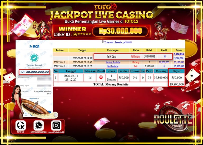 Selamat kepada Member Kami Pi***** Telah Jackpot dan berhasil mendapatkan kemenangan besar pada permainan JACKPOT LIVE GAME CASINO (ROULETTE) Dengan Kemenangan Sebesar Rp.30.000.000–. Setelah mengisi Fomulir Withdraw dengan Kurang waktu 1-2 Menit Dana sudah kami Trasnfer kepada Pemilik Userid dan dana sudah dapat di cairkan oleh pemenang. Bukti Pembayaran yang TOTO12 berikan merupakan Bukti Pembayaran yang …
