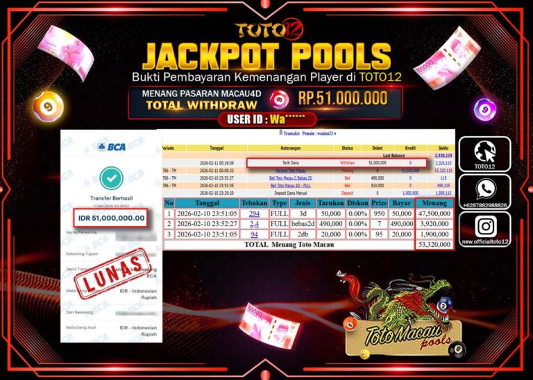 Selamat kepada Member Kami Wa***** Telah Jackpot dan berhasil mendapatkan kemenangan besar pada permainan JACKPOT POOLS PASARAN (MACAU 4D) Dengan Kemenangan Sebesar Rp.51.000.000–. Setelah mengisi Fomulir Withdraw dengan Kurang waktu 1-2 Menit Dana sudah kami Trasnfer kepada Pemilik Userid dan dana sudah dapat di cairkan oleh pemenang. Bukti Pembayaran yang TOTO12 berikan merupakan Bukti Pembayaran yang SAH…