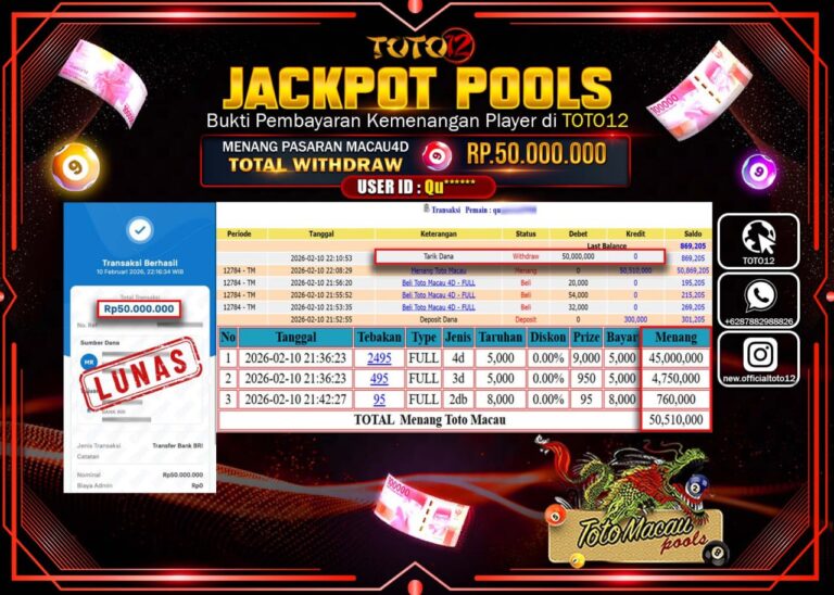 Selamat kepada Member Kami Qu***** Telah Jackpot dan berhasil mendapatkan kemenangan besar pada permainan JACKPOT POOLS PASARAN (MACAU 4D) Dengan Kemenangan Sebesar Rp.50.000.000–. Setelah mengisi Fomulir Withdraw dengan Kurang waktu 1-2 Menit Dana sudah kami Trasnfer kepada Pemilik Userid dan dana sudah dapat di cairkan oleh pemenang. Bukti Pembayaran yang TOTO12 berikan merupakan Bukti Pembayaran yang SAH…