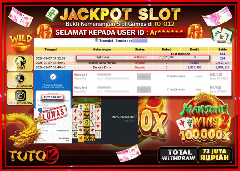 Selamat kepada Member Kami Ar***** Telah Jackpot dan berhasil mendapatkan kemenangan besar pada permainan JACKPOT SLOT GAME (MAHJONG WINS 2 ) Dengan Kemenangan Sebesar Rp.73.528.000–. Setelah mengisi Fomulir Withdraw dengan Kurang waktu 1-2 Menit Dana sudah kami Trasnfer kepada Pemilik Userid dan dana sudah dapat di cairkan oleh pemenang. Bukti Pembayaran yang TOTO12 berikan merupakan Bukti…