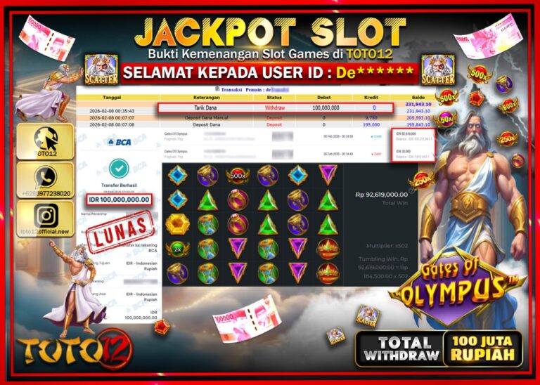 Selamat kepada Member Kami De***** Telah Jackpot dan berhasil mendapatkan kemenangan besar pada permainan JACKPOT SLOT GAME (GATES OF OLYMPUS ) Dengan Kemenangan Sebesar Rp.100.000.000–. Setelah mengisi Fomulir Withdraw dengan Kurang waktu 1-2 Menit Dana sudah kami Trasnfer kepada Pemilik Userid dan dana sudah dapat di cairkan oleh pemenang. Bukti Pembayaran yang TOTO12 berikan merupakan Bukti…
