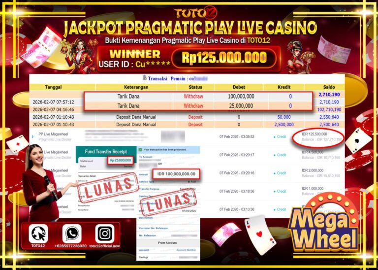 Selamat kepada Member Kami Cu****** Telah Jackpot dan berhasil mendapatkan kemenangan besar pada permainan JACKPOT PRAGMATIC PLAY LIVE CASINO (PP LIVE MEGAWHEEL) Dengan Kemenangan Sebesar Rp.125.000.000 –. Setelah mengisi Fomulir Withdraw dengan Kurang waktu 1-2 Menit Dana sudah kami Trasnfer kepada Pemilik Userid dan dana sudah dapat di cairkan oleh pemenang. Bukti Pembayaran yang TOTO12 berikan…