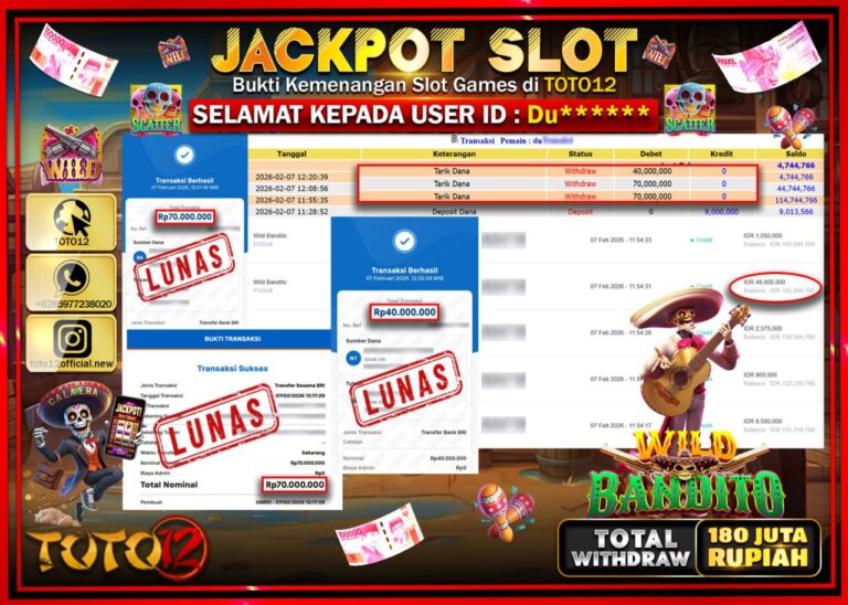 Selamat kepada Member Kami Du***** Telah Jackpot dan berhasil mendapatkan kemenangan besar pada permainan JACKPOT SLOT GAME (WILD BANDITO ) Dengan Kemenangan Sebesar Rp.180.000.000–. Setelah mengisi Fomulir Withdraw dengan Kurang waktu 1-2 Menit Dana sudah kami Trasnfer kepada Pemilik Userid dan dana sudah dapat di cairkan oleh pemenang. Bukti Pembayaran yang TOTO12 berikan merupakan Bukti Pembayaran…