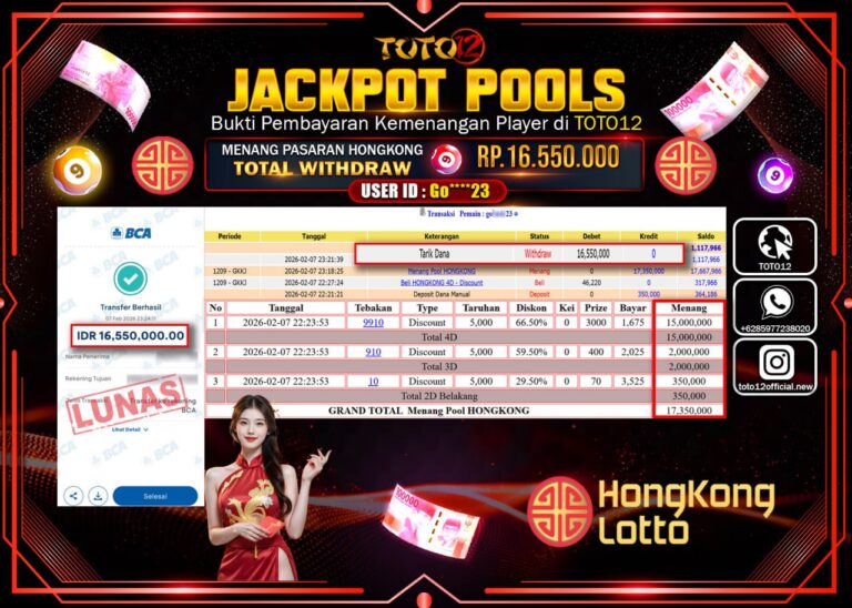 Selamat kepada Member Kami Go****23 Telah Jackpot dan berhasil mendapatkan kemenangan besar pada permainan JACKPOT POOLS PASARAN (HONGKONG) Dengan Kemenangan Sebesar Rp.16.550.000–. Setelah mengisi Fomulir Withdraw dengan Kurang waktu 1-2 Menit Dana sudah kami Trasnfer kepada Pemilik Userid dan dana sudah dapat di cairkan oleh pemenang. Bukti Pembayaran yang TOTO12 berikan merupakan Bukti Pembayaran yang SAH /…