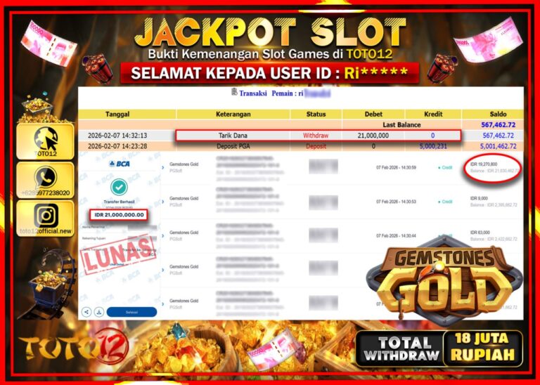 Selamat kepada Member Kami Ri*****Telah Jackpot dan berhasil mendapatkan kemenangan besar pada permainan JACKPOT SLOT GAME (JOHINGEMSTONES GOLD) Dengan Kemenangan Sebesar Rp.21.000.000–. Setelah mengisi Fomulir Withdraw dengan Kurang waktu 1-2 Menit Dana sudah kami Trasnfer kepada Pemilik Userid dan dana sudah dapat di cairkan oleh pemenang. Bukti Pembayaran yang TOTO12 berikan merupakan Bukti Pembayaran yang SAH /…