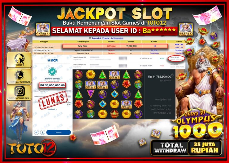 Selamat kepada Member Kami Ba*****Telah Jackpot dan berhasil mendapatkan kemenangan besar pada permainan JACKPOT SLOT GAME (GATES OF OLYMPUS 1000) Dengan Kemenangan Sebesar Rp.35.000.000–. Setelah mengisi Fomulir Withdraw dengan Kurang waktu 1-2 Menit Dana sudah kami Trasnfer kepada Pemilik Userid dan dana sudah dapat di cairkan oleh pemenang. Bukti Pembayaran yang TOTO12 berikan merupakan Bukti Pembayaran…