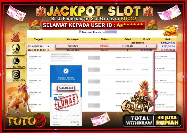 Selamat kepada Member Kami As*****Telah Jackpot dan berhasil mendapatkan kemenangan besar pada permainan JACKPOT SLOT GAME (WAYS OF THE QILIN) Dengan Kemenangan Sebesar Rp.44.300.000–. Setelah mengisi Fomulir Withdraw dengan Kurang waktu 1-2 Menit Dana sudah kami Trasnfer kepada Pemilik Userid dan dana sudah dapat di cairkan oleh pemenang. Bukti Pembayaran yang TOTO12 berikan merupakan Bukti Pembayaran…