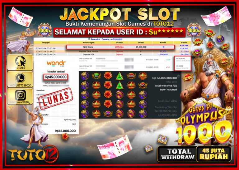 Selamat kepada Member Kami Su***** Telah Jackpot dan berhasil mendapatkan kemenangan besar pada permainan JACKPOT SLOT GAME (GATES OF OLYMPUS 1000) Dengan Kemenangan Sebesar Rp.45.000.000–. Setelah mengisi Fomulir Withdraw dengan Kurang waktu 1-2 Menit Dana sudah kami Trasnfer kepada Pemilik Userid dan dana sudah dapat di cairkan oleh pemenang. Bukti Pembayaran yang TOTO12 berikan merupakan Bukti…