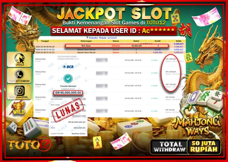 Selamat kepada Member Kami Ac***** Telah Jackpot dan berhasil mendapatkan kemenangan besar pada permainan JACKPOT SLOT GAME (MAHJONG WAYS) Dengan Kemenangan Sebesar Rp.50.000.000–. Setelah mengisi Fomulir Withdraw dengan Kurang waktu 1-2 Menit Dana sudah kami Trasnfer kepada Pemilik Userid dan dana sudah dapat di cairkan oleh pemenang. Bukti Pembayaran yang TOTO12 berikan merupakan Bukti Pembayaran yang SAH…
