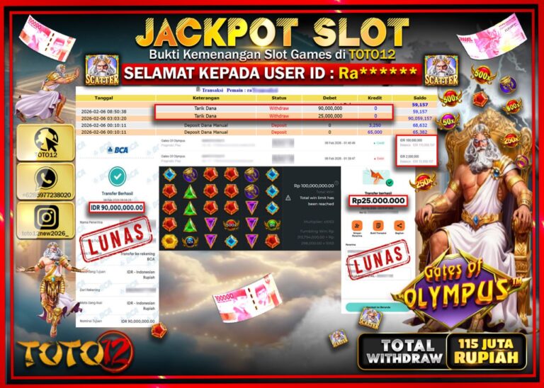 Selamat kepada Member Kami Ra***** Telah Jackpot dan berhasil mendapatkan kemenangan besar pada permainan JACKPOT SLOT GAME (GATES OF OLYMPUS ) Dengan Kemenangan Sebesar Rp.115.000.000–. Setelah mengisi Fomulir Withdraw dengan Kurang waktu 1-2 Menit Dana sudah kami Trasnfer kepada Pemilik Userid dan dana sudah dapat di cairkan oleh pemenang. Bukti Pembayaran yang TOTO12 berikan merupakan Bukti…