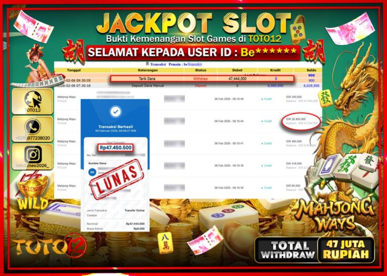 Selamat kepada Member Kami Be***** Telah Jackpot dan berhasil mendapatkan kemenangan besar pada permainan JACKPOT SLOT GAME (MAHJONG WAYS) Dengan Kemenangan Sebesar Rp.47.444.000–. Setelah mengisi Fomulir Withdraw dengan Kurang waktu 1-2 Menit Dana sudah kami Trasnfer kepada Pemilik Userid dan dana sudah dapat di cairkan oleh pemenang. Bukti Pembayaran yang TOTO12 berikan merupakan Bukti Pembayaran yang SAH…