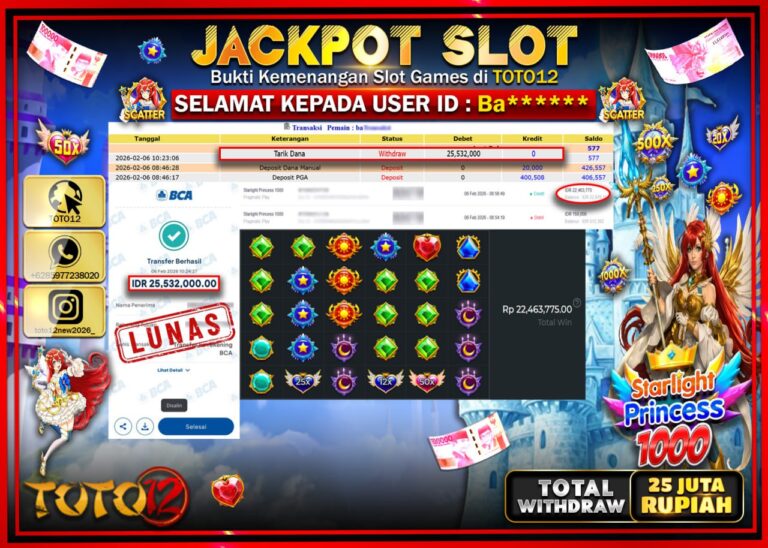 Selamat kepada Member Kami Ba***** Telah Jackpot dan berhasil mendapatkan kemenangan besar pada permainan JACKPOT SLOT GAME (STARLIGHT PRINCESS 1000 ) Dengan Kemenangan Sebesar Rp.25.532.000–. Setelah mengisi Fomulir Withdraw dengan Kurang waktu 1-2 Menit Dana sudah kami Trasnfer kepada Pemilik Userid dan dana sudah dapat di cairkan oleh pemenang. Bukti Pembayaran yang TOTO12 berikan merupakan Bukti…