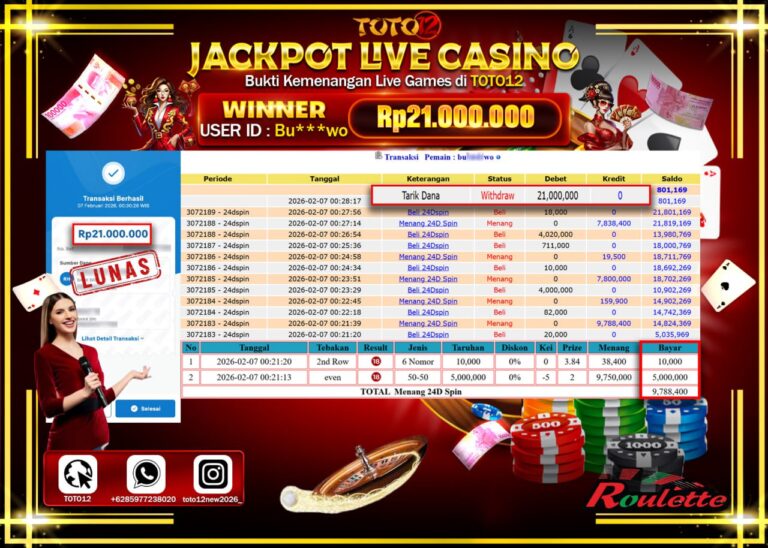 Selamat kepada Member Kami BU*****wo Telah Jackpot dan berhasil mendapatkan kemenangan besar pada permainan JACKPOT LIVE CASINO (24D SPIN) Dengan Kemenangan Sebesar Rp.21.000.000 –. Setelah mengisi Fomulir Withdraw dengan Kurang waktu 1-2 Menit Dana sudah kami Trasnfer kepada Pemilik Userid dan dana sudah dapat di cairkan oleh pemenang. Bukti Pembayaran yang TOTO12 berikan merupakan Bukti Pembayaran…