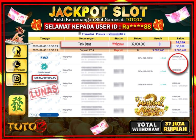 Selamat kepada Member Kami Ra****88 Telah Jackpot dan berhasil mendapatkan kemenangan besar pada permainan JACKPOT SLOT GAME (MAHJONG WAYS) Dengan Kemenangan Sebesar Rp.37.000.000–. Setelah mengisi Fomulir Withdraw dengan Kurang waktu 1-2 Menit Dana sudah kami Trasnfer kepada Pemilik Userid dan dana sudah dapat di cairkan oleh pemenang. Bukti Pembayaran yang TOTO12 berikan merupakan Bukti Pembayaran yang SAH…