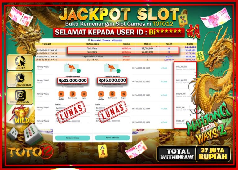 Selamat kepada Member Kami Bi*****Telah Jackpot dan berhasil mendapatkan kemenangan besar pada permainan JACKPOT SLOT GAME (MAHJONG WAYS 2) Dengan Kemenangan Sebesar Rp.37.000.000–. Setelah mengisi Fomulir Withdraw dengan Kurang waktu 1-2 Menit Dana sudah kami Trasnfer kepada Pemilik Userid dan dana sudah dapat di cairkan oleh pemenang. Bukti Pembayaran yang TOTO12 berikan merupakan Bukti Pembayaran yang SAH…
