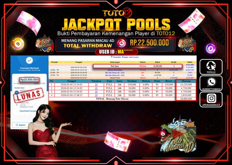 Selamat kepada Member Kami Ma****** Telah Jackpot dan berhasil mendapatkan kemenangan besar pada permainan JACKPOT POOLS PASARAN (MACAU 4D) Dengan Kemenangan Sebesar Rp.22.500.000 –. Setelah mengisi Fomulir Withdraw dengan Kurang waktu 1-2 Menit Dana sudah kami Trasnfer kepada Pemilik Userid dan dana sudah dapat di cairkan oleh pemenang. Bukti Pembayaran yang TOTO12 berikan merupakan Bukti Pembayaran…