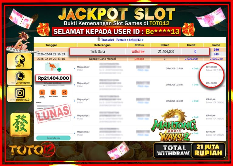 Selamat kepada Member Kami Be****** Telah Jackpot dan berhasil mendapatkan kemenangan besar pada permainan JACKPOT SLOT GAME (MAHJONG WAYS 2) Dengan Kemenangan Sebesar Rp.21.404.000 –. Setelah mengisi Fomulir Withdraw dengan Kurang waktu 1-2 Menit Dana sudah kami Trasnfer kepada Pemilik Userid dan dana sudah dapat di cairkan oleh pemenang. Bukti Pembayaran yang TOTO12 berikan merupakan Bukti…