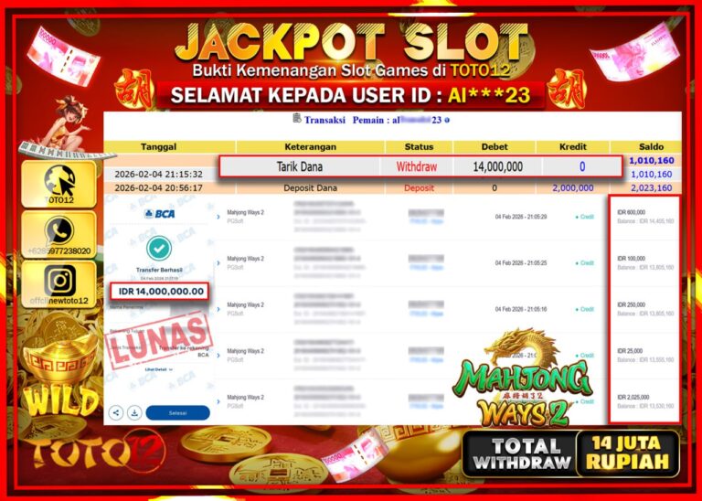 Selamat kepada Member Kami Al****** Telah Jackpot dan berhasil mendapatkan kemenangan besar pada permainan JACKPOT SLOT GAME (MAHJONG WAYS 2) Dengan Kemenangan Sebesar Rp.14.000.000 –. Setelah mengisi Fomulir Withdraw dengan Kurang waktu 1-2 Menit Dana sudah kami Trasnfer kepada Pemilik Userid dan dana sudah dapat di cairkan oleh pemenang. Bukti Pembayaran yang TOTO12 berikan merupakan Bukti…