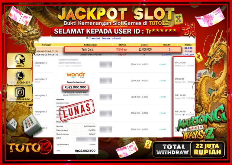 Selamat kepada Member Kami Tr***** Telah Jackpot dan berhasil mendapatkan kemenangan besar pada permainan JACKPOT SLOT GAME (MAHJONG WAYS 2) Dengan Kemenangan Sebesar Rp.22.000.000–. Setelah mengisi Fomulir Withdraw dengan Kurang waktu 1-2 Menit Dana sudah kami Trasnfer kepada Pemilik Userid dan dana sudah dapat di cairkan oleh pemenang. Bukti Pembayaran yang TOTO12 berikan merupakan Bukti Pembayaran…