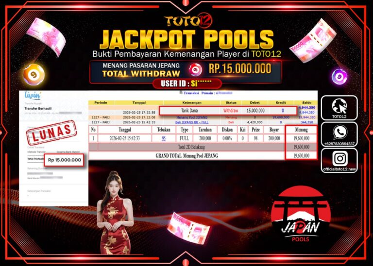 Selamat kepada Member Kami Yu****** Telah Jackpot dan berhasil mendapatkan kemenangan besar pada permainan JACKPOT POOLS PASARAN (HONGKONG) Dengan Kemenangan Sebesar Rp.16.300.000–. Setelah mengisi Fomulir Withdraw dengan Kurang waktu 1-2 Menit Dana sudah kami Trasnfer kepada Pemilik Userid dan dana sudah dapat di cairkan oleh pemenang. Bukti Pembayaran yang TOTO12 berikan merupakan Bukti Pembayaran yang SAH /…