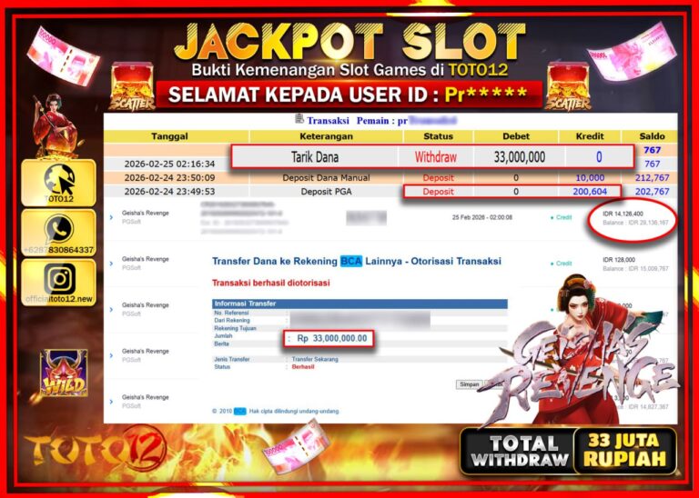 Selamat kepada Member Kami Pr***** Telah Jackpot dan berhasil mendapatkan kemenangan besar pada permainan JACKPOT SLOT GAME (GEISHA’S REVENGE) Dengan Kemenangan Sebesar Rp.33.000.000–. Setelah mengisi Fomulir Withdraw dengan Kurang waktu 1-2 Menit Dana sudah kami Trasnfer kepada Pemilik Userid dan dana sudah dapat di cairkan oleh pemenang. Bukti Pembayaran yang TOTO12 berikan merupakan Bukti Pembayaran yang SAH…