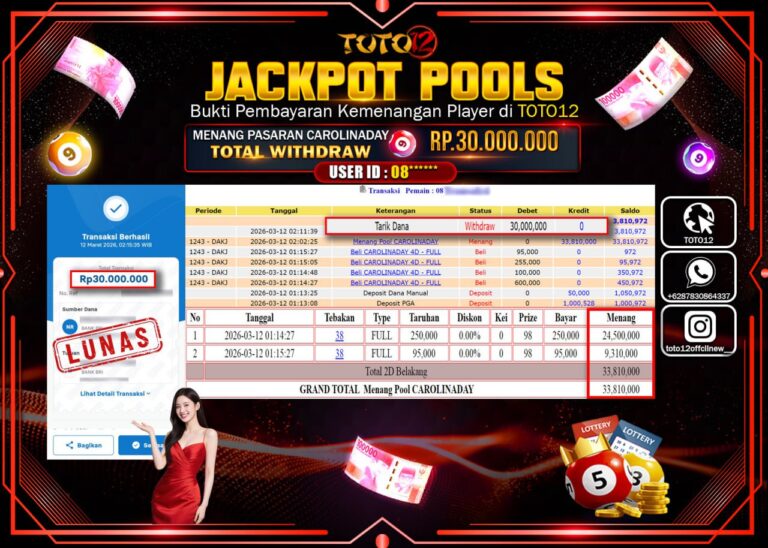 Selamat kepada Member Kami 08****** Telah Jackpot dan berhasil mendapatkan kemenangan besar pada permainan JACKPOT POOLS PASARAN (CAROLINADAY) Dengan Kemenangan Sebesar Rp.30.000.000–. Setelah mengisi Fomulir Withdraw dengan Kurang waktu 1-2 Menit Dana sudah kami Trasnfer kepada Pemilik Userid dan dana sudah dapat di cairkan oleh pemenang. Bukti Pembayaran yang TOTO12 berikan merupakan Bukti Pembayaran yang SAH /…