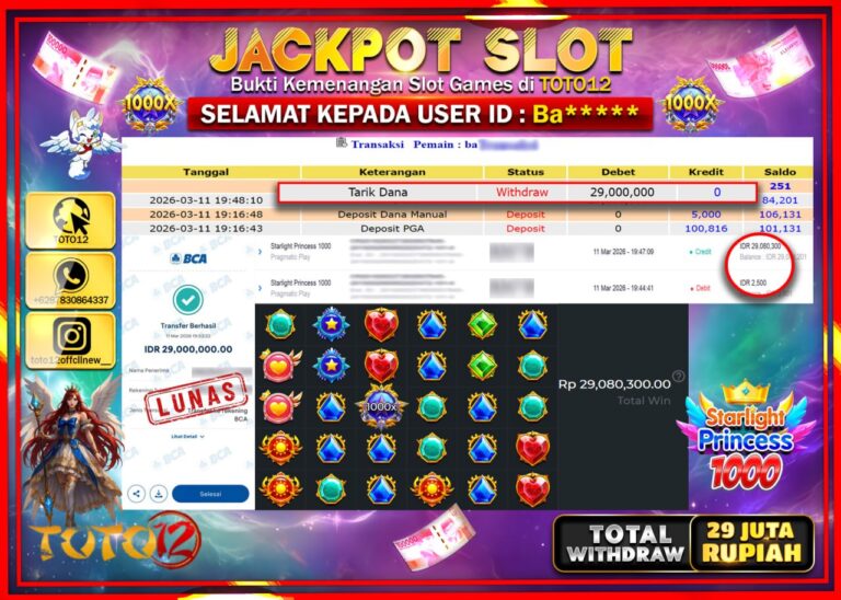 Selamat kepada Member Kami Ba****** Telah Jackpot dan berhasil mendapatkan kemenangan besar pada permainan JACKPOT SLOT GAME (STARLIGHT PRINCESS 1000) Dengan Kemenangan Sebesar Rp.29.000.000–. Setelah mengisi Fomulir Withdraw dengan Kurang waktu 1-2 Menit Dana sudah kami Trasnfer kepada Pemilik Userid dan dana sudah dapat di cairkan oleh pemenang. Bukti Pembayaran yang TOTO12 berikan merupakan Bukti Pembayaran…