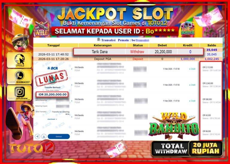 Selamat kepada Member Kami Bo****** Telah Jackpot dan berhasil mendapatkan kemenangan besar pada permainan JACKPOT SLOT GAME (WILD BANDITO) Dengan Kemenangan Sebesar Rp.20.200.000–. Setelah mengisi Fomulir Withdraw dengan Kurang waktu 1-2 Menit Dana sudah kami Trasnfer kepada Pemilik Userid dan dana sudah dapat di cairkan oleh pemenang. Bukti Pembayaran yang TOTO12 berikan merupakan Bukti Pembayaran yang SAH…
