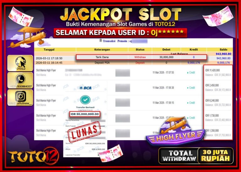 Selamat kepada Member Kami 0J****** Telah Jackpot dan berhasil mendapatkan kemenangan besar pada permainan JACKPOT SLOT GAME (HIGH FLYER) Dengan Kemenangan Sebesar Rp.30.000.000–. Setelah mengisi Fomulir Withdraw dengan Kurang waktu 1-2 Menit Dana sudah kami Trasnfer kepada Pemilik Userid dan dana sudah dapat di cairkan oleh pemenang. Bukti Pembayaran yang TOTO12 berikan merupakan Bukti Pembayaran yang SAH…