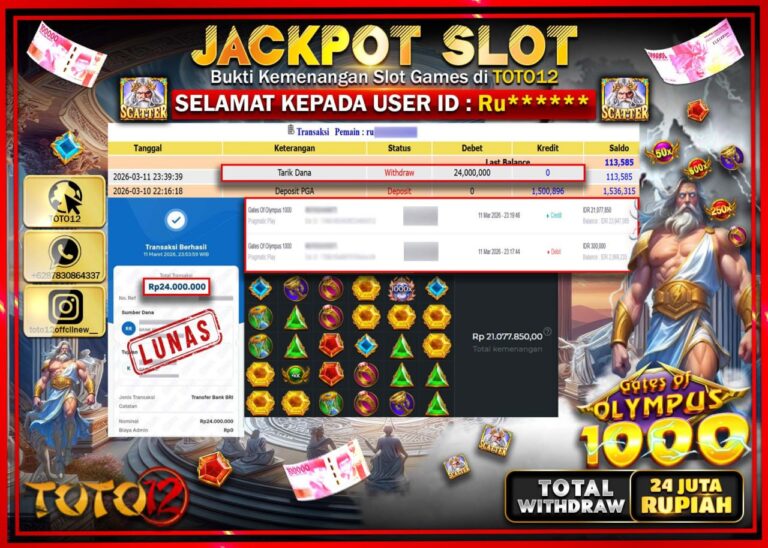 Selamat kepada Member Kami Ru****** Telah Jackpot dan berhasil mendapatkan kemenangan besar pada permainan JACKPOT SLOT GAME (GATES OF OLYMPUS 1000) Dengan Kemenangan Sebesar Rp.24.000.000–. Setelah mengisi Fomulir Withdraw dengan Kurang waktu 1-2 Menit Dana sudah kami Trasnfer kepada Pemilik Userid dan dana sudah dapat di cairkan oleh pemenang. Bukti Pembayaran yang TOTO12 berikan merupakan Bukti…