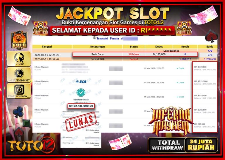 Selamat kepada Member Kami Ri****** Telah Jackpot dan berhasil mendapatkan kemenangan besar pada permainan JACKPOT SLOT GAME (INFERNO MAYHEM) Dengan Kemenangan Sebesar Rp.34.000.000–. Setelah mengisi Fomulir Withdraw dengan Kurang waktu 1-2 Menit Dana sudah kami Trasnfer kepada Pemilik Userid dan dana sudah dapat di cairkan oleh pemenang. Bukti Pembayaran yang TOTO12 berikan merupakan Bukti Pembayaran yang SAH…