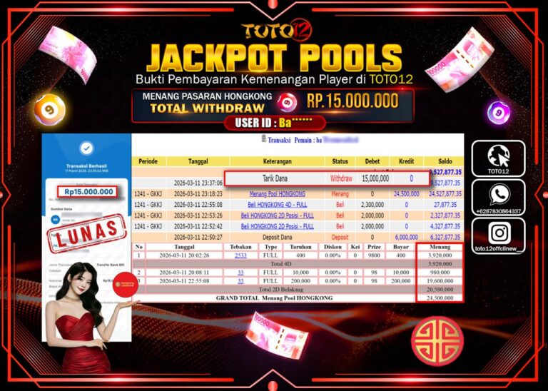 Selamat kepada Member Kami Ba****** Telah Jackpot dan berhasil mendapatkan kemenangan besar pada permainan JACKPOT POOLS PASARAN (HONGKONG) Dengan Kemenangan Sebesar Rp.15.000.000–. Setelah mengisi Fomulir Withdraw dengan Kurang waktu 1-2 Menit Dana sudah kami Trasnfer kepada Pemilik Userid dan dana sudah dapat di cairkan oleh pemenang. Bukti Pembayaran yang TOTO12 berikan merupakan Bukti Pembayaran yang SAH /…
