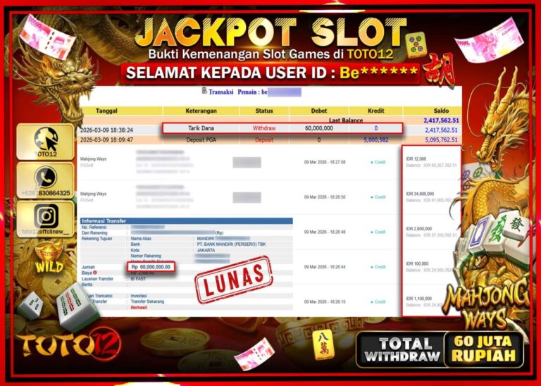 Selamat kepada Member Kami Be**** Telah Jackpot dan berhasil mendapatkan kemenangan besar pada permainan JACKPOT SLOT GAME (MAHJONG WAYS) Dengan Kemenangan Sebesar Rp.60.000.000–. Setelah mengisi Fomulir Withdraw dengan Kurang waktu 1-2 Menit Dana sudah kami Trasnfer kepada Pemilik Userid dan dana sudah dapat di cairkan oleh pemenang. Bukti Pembayaran yang TOTO12 berikan merupakan Bukti Pembayaran yang SAH…