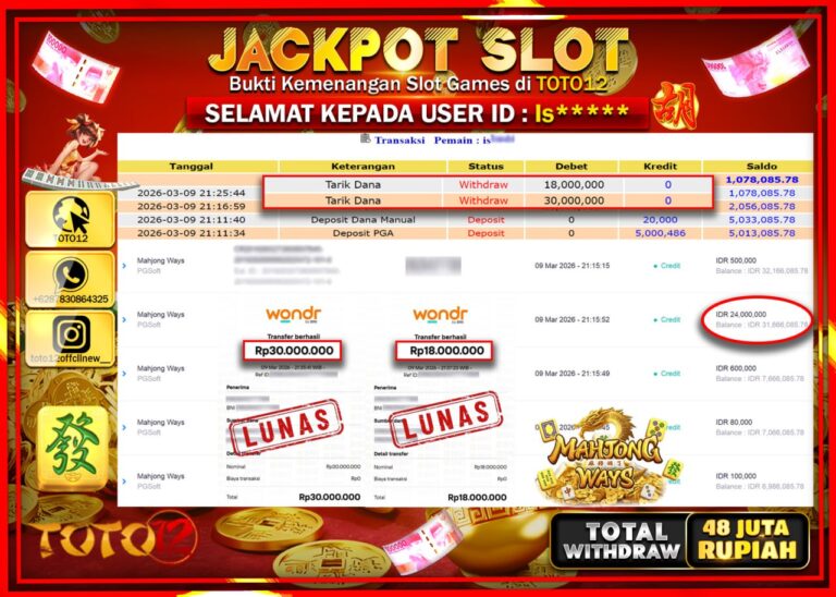 Selamat kepada Member Kami Is**** Telah Jackpot dan berhasil mendapatkan kemenangan besar pada permainan JACKPOT SLOT GAME (MAHJONG WAYS) Dengan Kemenangan Sebesar Rp.48.000.000–. Setelah mengisi Fomulir Withdraw dengan Kurang waktu 1-2 Menit Dana sudah kami Trasnfer kepada Pemilik Userid dan dana sudah dapat di cairkan oleh pemenang. Bukti Pembayaran yang TOTO12 berikan merupakan Bukti Pembayaran yang SAH…