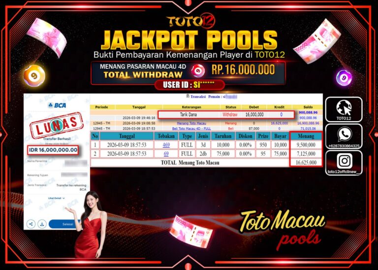 Selamat kepada Member Kami Si****** Telah Jackpot dan berhasil mendapatkan kemenangan besar pada permainan JACKPOT POOLS PASARAN (MACAU 4D) Dengan Kemenangan Sebesar Rp.16.000.000–. Setelah mengisi Fomulir Withdraw dengan Kurang waktu 1-2 Menit Dana sudah kami Trasnfer kepada Pemilik Userid dan dana sudah dapat di cairkan oleh pemenang. Bukti Pembayaran yang TOTO12 berikan merupakan Bukti Pembayaran yang SAH…