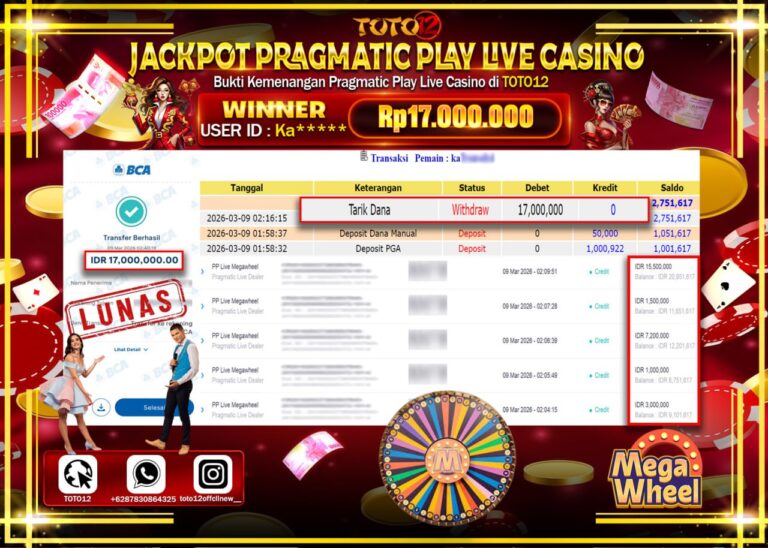Selamat kepada Member Kami Ka****** Telah Jackpot dan berhasil mendapatkan kemenangan besar pada permainan JACKPOT PRAGMATIC PLAY LIVE GAME CASINO (PP LIVE MEGAWHEEL) Dengan Kemenangan Sebesar Rp.17.000.000–. Setelah mengisi Fomulir Withdraw dengan Kurang waktu 1-2 Menit Dana sudah kami Trasnfer kepada Pemilik Userid dan dana sudah dapat di cairkan oleh pemenang. Bukti Pembayaran yang TOTO12 berikan…