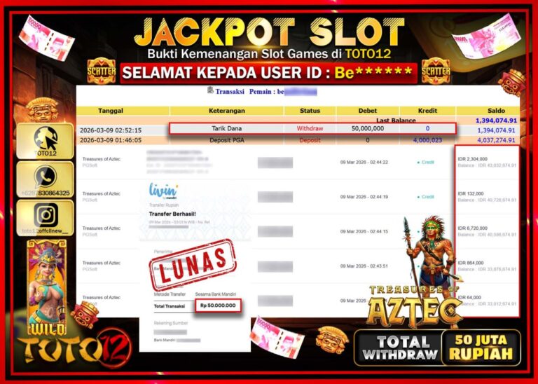 Selamat kepada Member Kami Be**** Telah Jackpot dan berhasil mendapatkan kemenangan besar pada permainan JACKPOT SLOT GAME (TREASURES OF AZTEC) Dengan Kemenangan Sebesar Rp.50.000.000–. Setelah mengisi Fomulir Withdraw dengan Kurang waktu 1-2 Menit Dana sudah kami Trasnfer kepada Pemilik Userid dan dana sudah dapat di cairkan oleh pemenang. Bukti Pembayaran yang TOTO12 berikan merupakan Bukti Pembayaran…