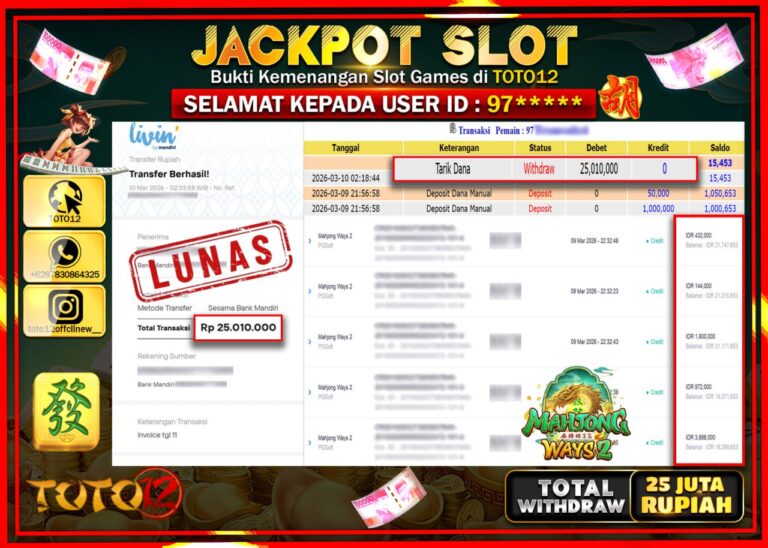 Selamat kepada Member Kami 97**** Telah Jackpot dan berhasil mendapatkan kemenangan besar pada permainan JACKPOT SLOT GAME (MAHJONG WAYS 2) Dengan Kemenangan Sebesar Rp.25.010.000–. Setelah mengisi Fomulir Withdraw dengan Kurang waktu 1-2 Menit Dana sudah kami Trasnfer kepada Pemilik Userid dan dana sudah dapat di cairkan oleh pemenang. Bukti Pembayaran yang TOTO12 berikan merupakan Bukti Pembayaran…