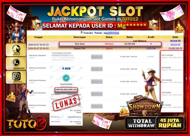 Selamat kepada Member Kami Mg**** Telah Jackpot dan berhasil mendapatkan kemenangan besar pada permainan JACKPOT SLOT GAME (WILD BOUNTY SHOWDOWN) Dengan Kemenangan Sebesar Rp.45.500.000–. Setelah mengisi Fomulir Withdraw dengan Kurang waktu 1-2 Menit Dana sudah kami Trasnfer kepada Pemilik Userid dan dana sudah dapat di cairkan oleh pemenang. Bukti Pembayaran yang TOTO12 berikan merupakan Bukti Pembayaran…