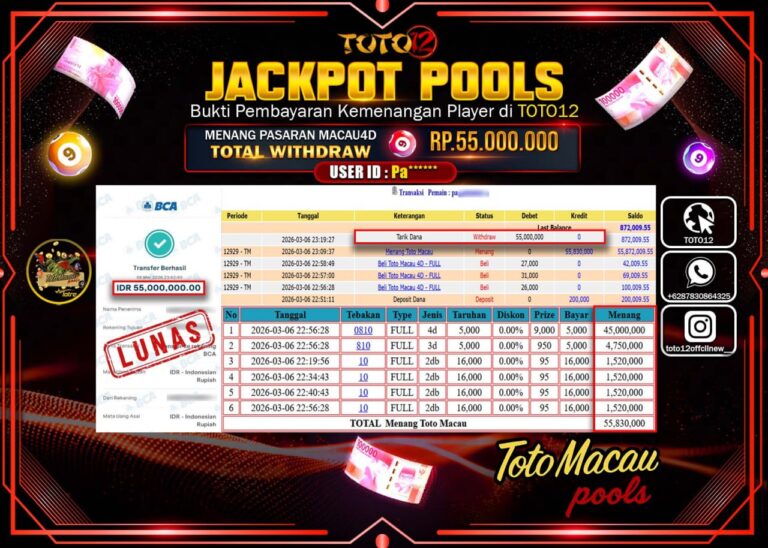 Selamat kepada Member Kami Pa****** Telah Jackpot dan berhasil mendapatkan kemenangan besar pada permainan JACKPOT POOLS PASARAN (TOTOMACAU 4D) Dengan Kemenangan Sebesar Rp.55.000.000–. Setelah mengisi Fomulir Withdraw dengan Kurang waktu 1-2 Menit Dana sudah kami Trasnfer kepada Pemilik Userid dan dana sudah dapat di cairkan oleh pemenang. Bukti Pembayaran yang TOTO12 berikan merupakan Bukti Pembayaran yang SAH…
