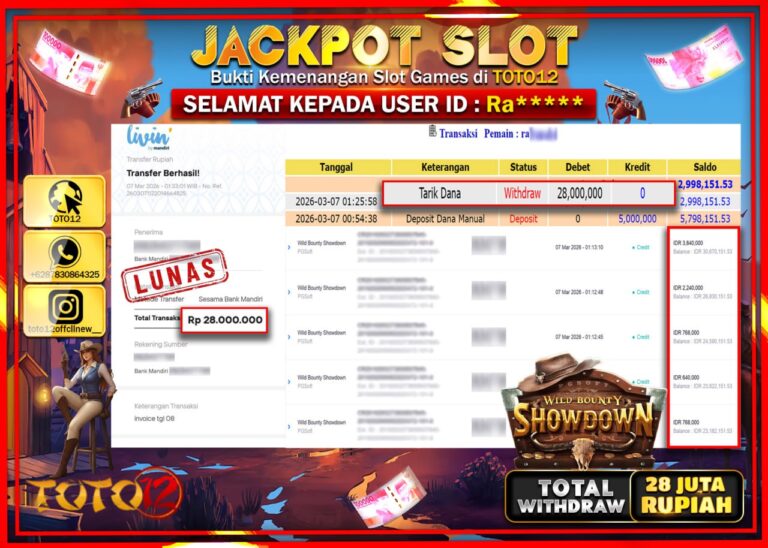 Selamat kepada Member Kami Ra**** Telah Jackpot dan berhasil mendapatkan kemenangan besar pada permainan JACKPOT SLOT GAME (WILD BOUNTY SHOWDOWN) Dengan Kemenangan Sebesar Rp.28.000.000–. Setelah mengisi Fomulir Withdraw dengan Kurang waktu 1-2 Menit Dana sudah kami Trasnfer kepada Pemilik Userid dan dana sudah dapat di cairkan oleh pemenang. Bukti Pembayaran yang TOTO12 berikan merupakan Bukti Pembayaran…